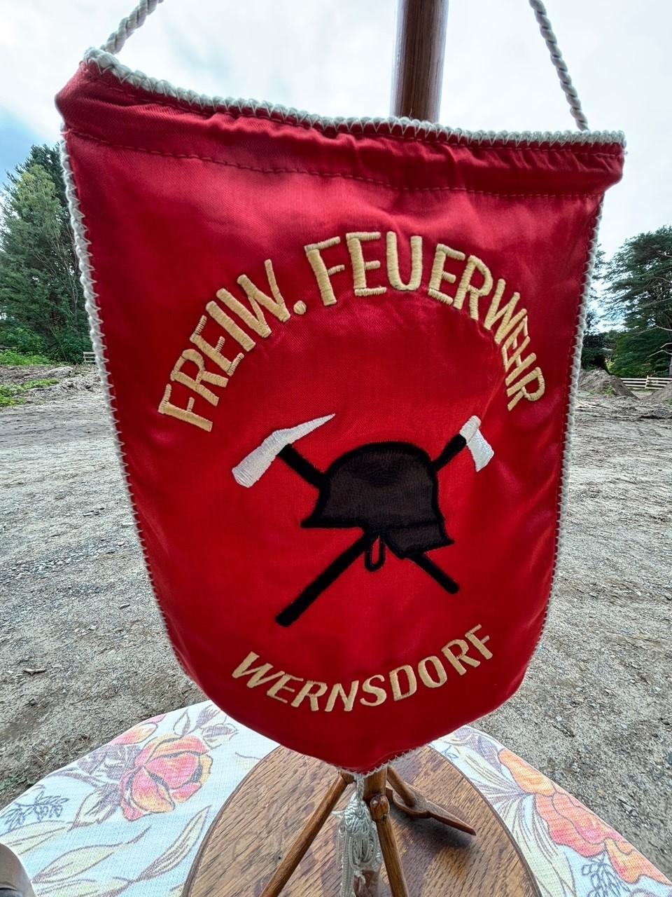 Fotografie der Kameraden der Freiwilligen Feuerwehr Wernsdorf (etwa um 1920), deren Verdienste in der Festrede des Ortswehrführers Marcel Schust hervorgehoben und gewürdigt wurden